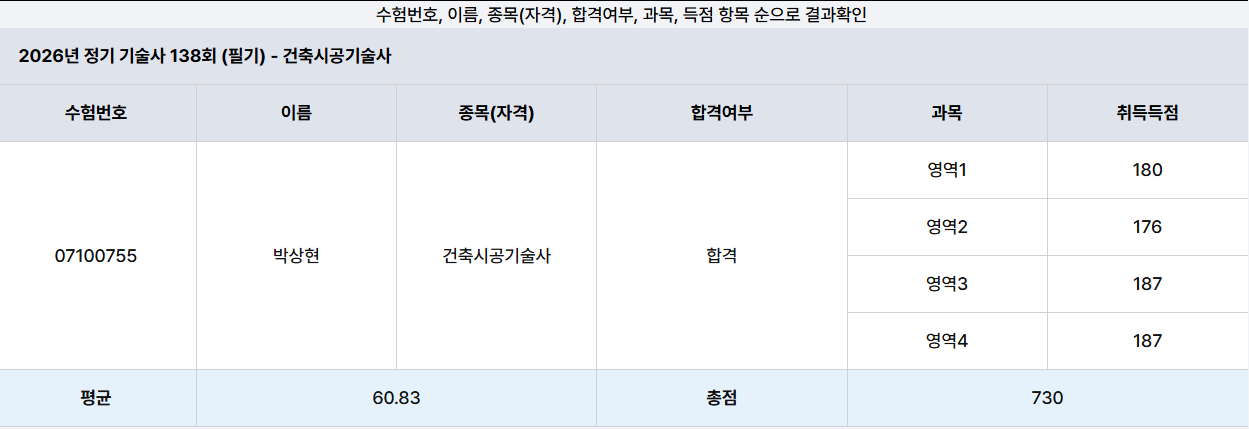 안녕하세요 우주최강 1조 조장 박상현입니다. 금번 138회 건축시공기술사 필기 시험에 60.8점으로 합격하게 되었습니다. 시험 2번 응시했고, 총 공부 기간은 8개월입니다. 먼저 항상 응원해주시고 격려해주셨던 조원분들, 수강생분들께 분들께 감사 인사드립니다. 합격했다는게 아직도 실감이 나지 않고 어안이 벙벙하지만, 필기 합격까지의 과정과 공부하면서 느꼈던 것들, 정량적인 공부량 등을 공유드리고 다음 시험을 준비하는 기술사님들께 도움이 되고자 합격 수기 적어봅니다.